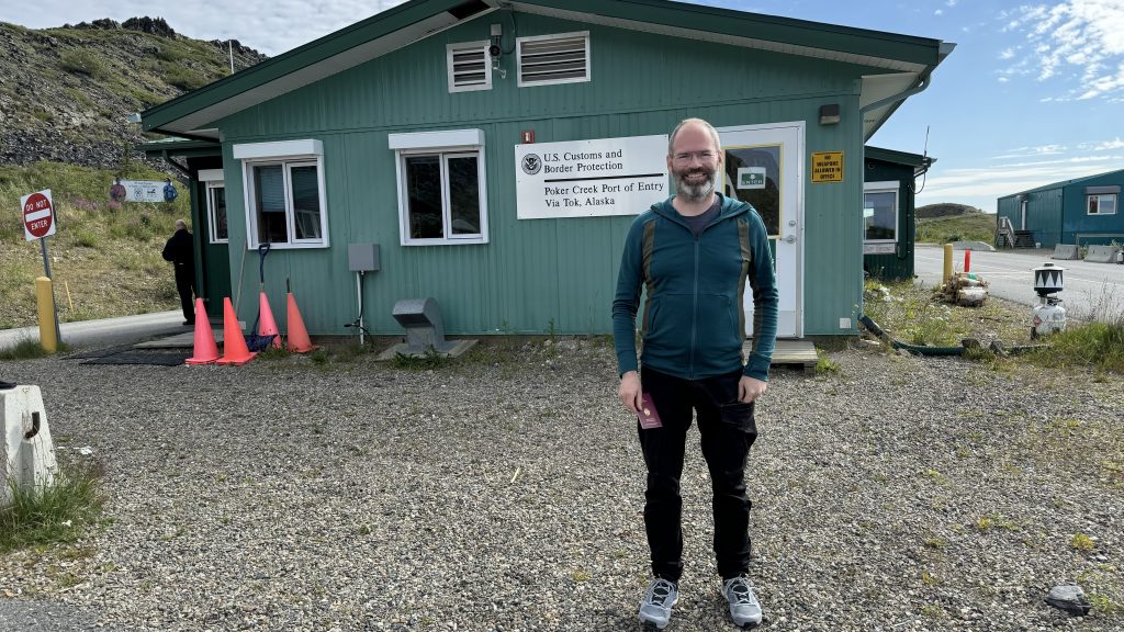 Für uns ging es von Dawson City weiter auf dem Top of the World Highway, auch das ein Erlebnis. Schon der Start ist spannend, wir stehen 1h an, um mit der kostenlosen Fähre an das Westufer des Yukon-Flusses gebracht zu werden. Auf den Bildern seht ihr, wie klein und eng die Fähre ist… Der Highway ist meist eine recht ordentliche Schotterstraße und führt über die Höhenzüge. Er verläuft oft direkt auf den Bergrücken, sodass man ewig weit über die Gebirgszüge links und rechts der Straße blicken kann, häufig natürlich auch runter in die malerischen Täler. Das war sehr beeindruckend und wir kamen aus dem Staunen nicht mehr raus! Dieser Highway führt uns auch zur Grenze in die USA, nach Alaska.