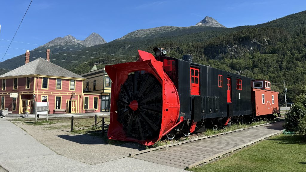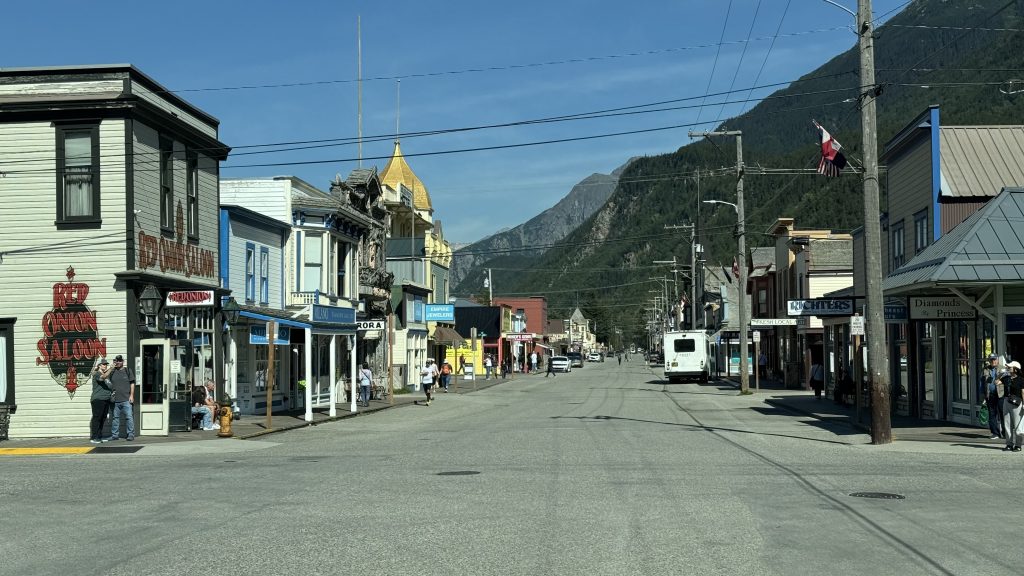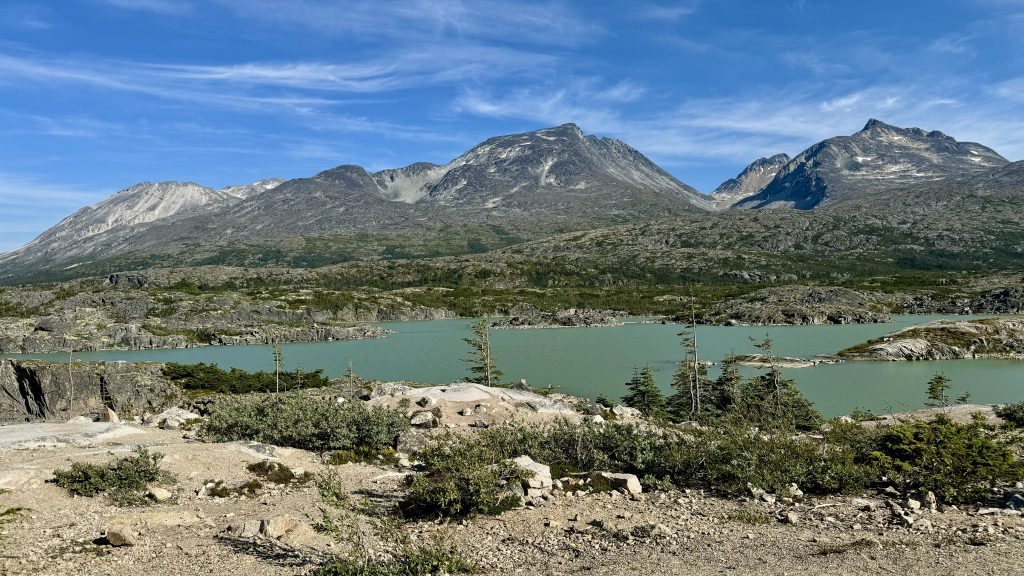 Am nächsten Tag fahren wir per Fähre nach Skagway, die Goldgräberstadt ist ein beliebter Kreuzfahrthafen und als wir ankommen sind 3 Kreuzfahrtschiffe da. Das Städtchen besteht aus einer schmucken Straße, dem Broadway. Drumherum ist es dann schnell deutlich ruhiger und so haben wir zügig alles gesehen und fahren nach Kanada weiter. Die Grenze ist nur ca. 50km entfernt und sie liegt auf einem wundervoll gelegenen Pass, auch dies ist eine traumhafte Strecke. Auf der Höhe passieren wir viele langgestreckte Seen, die sich zwischen der steinernen Landschaft malerisch einbetten. Irgendwie sieht es aus wie die Schären in Skandinavien, nur eben oben auf dem Berg.