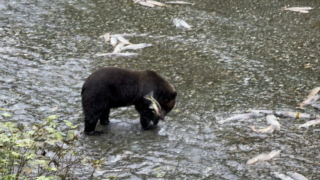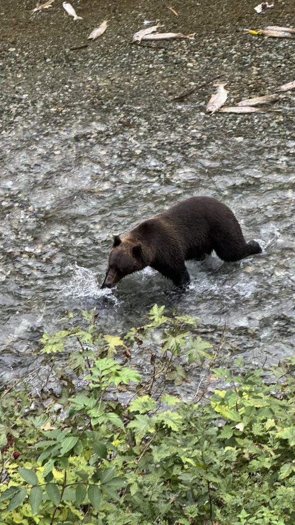 English: Heading south from Alaska main land, we jump from Alaska to Canada in and out several times, and we get back to better weather. As fall is approaching, leaves start turning amber leaving an impression of golden August. We get to see a couple of brown bears fishing for salmon, both in Haines and Hyder, whilst the latter is the most impressive stop therefore, as you will see many salmon in the river, many alive, some spawning and some already dead. The bears go after the alive ones successfully. In Hyder we also see the amazing Salmon Glacier with a stunning view from above. We also hit the gold rush city of Skagway and the small village of Carcross, which claims to have the smallest desert on earth. This has been an enjoyable stint 🙂
