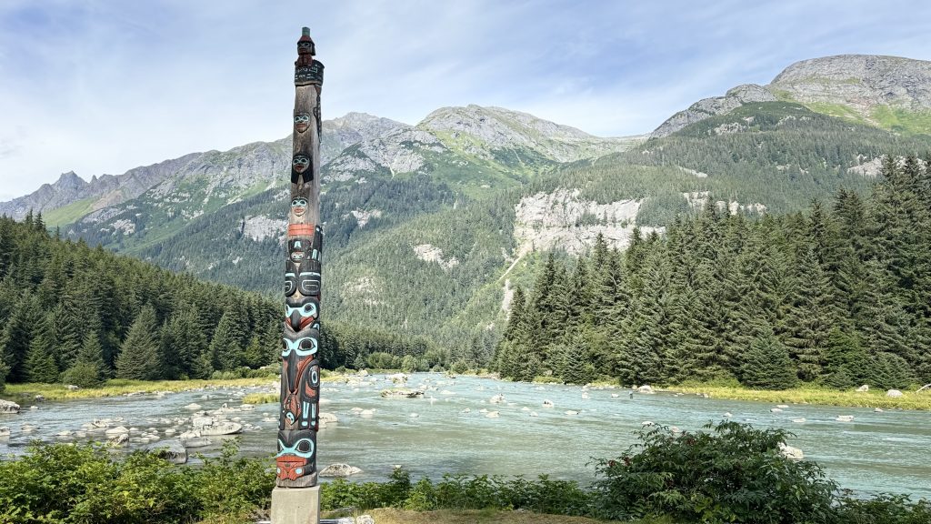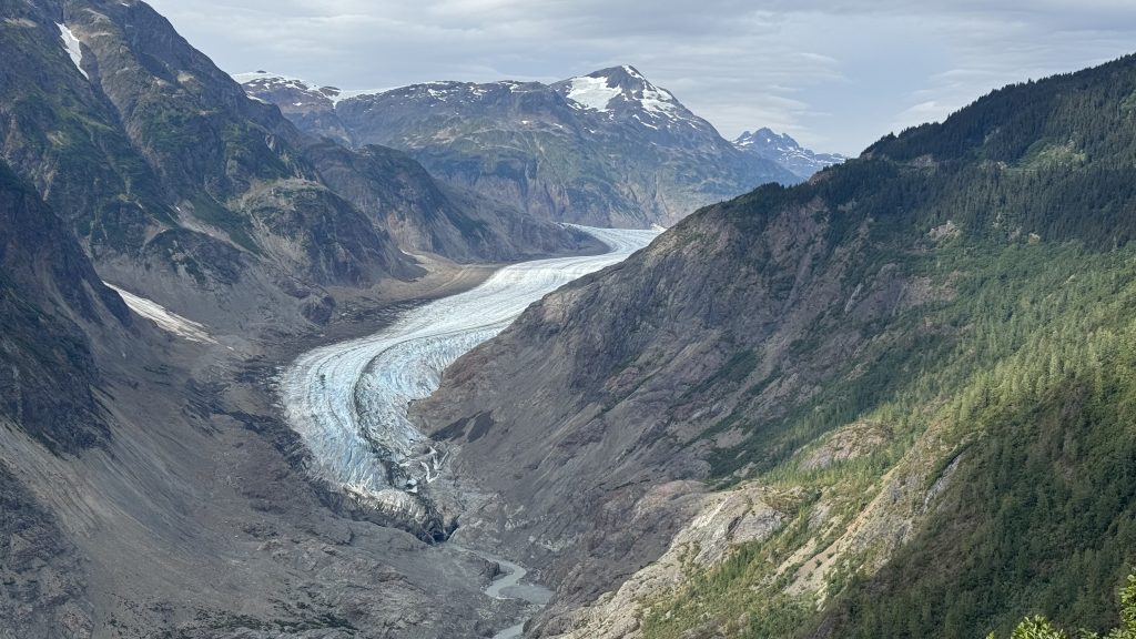 Wir reisen aus dem Hauptteil von Alaska nach Süden aus und durchqueren den südlichen Yukon (Kanada). Der Kluane National Park zeigt sich meist in graue Wolken gehüllt und wir lassen ihn daher weitestgehend rechts liegen, nur eine Wanderung bietet sich an, da krabbeln wir die Endmoräne eines ehemaligen Gletschers hoch, ein spannendes Erlebnis mit ein paar schönen Blicken. Wir merken jedoch auch noch die Folgen von Corona und halten die Wanderung entsprechend kurz, um uns zu schonen. Ab dem nächsten Tag kommt die Sonne raus (yeah!) und wir fahren ans Meer nach Haines, das liegt wieder in Alaska. Die Straße dahin ist ein Traum: Panoramen mit Gletschern bieten sich wo man hinschaut, wir genießen die Fahrt und reisen kurz vor der Stadt wieder in die USA ein. Haines liegt an einem Meeresarm und wir bleiben 2 Nächte mit Blick auf die Bucht und ein paar Gletschern stehen. In diesem Dorf genießen wir Temperaturen um die 23 Grad und Sonne, das tut sooo gut! Und wir können Lachse beobachten wie sie den Chilkoot River hochschwimmen, einige sehen wir sogar direkt vor unseren Augen laichen. Das entgeht auch den Braunbären nicht, für die sind Lachse ein Leckerbissen vor dem Winter. Braunbären sind im Prinzip große Grizzlies, die an der Küste leben. Man geht davon aus, dass sie wegen der nahrhaften Lachse einfach viel größer werden als die Grizzlies im Inland, die nur von Pflanzen und Beeren leben. So ein Braunbär an Alaskas Küste wird gut über 2m groß, wenn er sich aufrichtet. Wir können einen Braunbären am Chilkoot River beim Lachsfischen beobachten, das ist beeindruckend, wir machen viele Fotos 🙂
