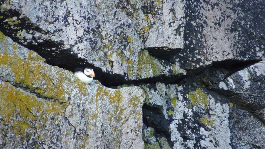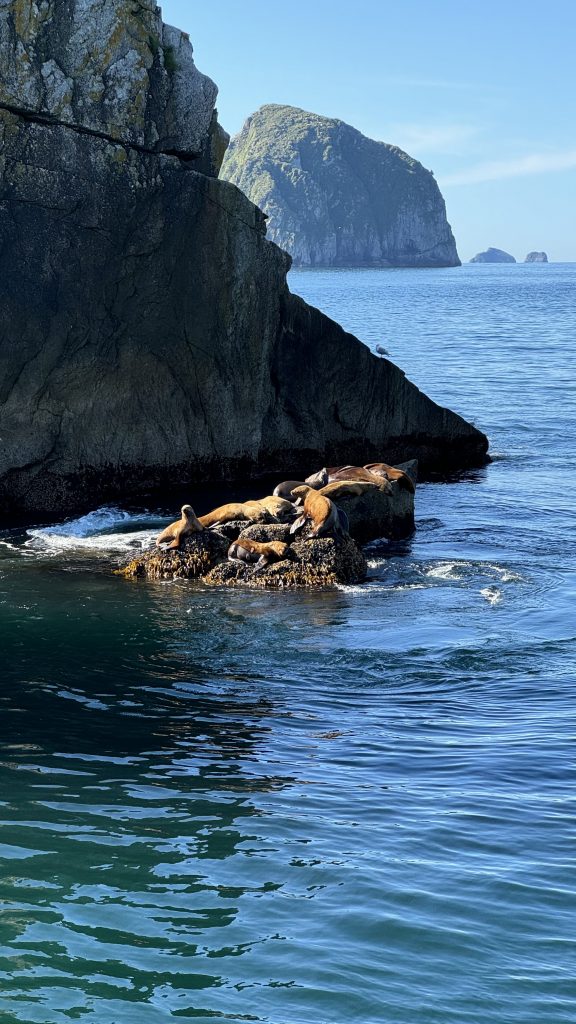 Auf dem Weg sehen wir auch einige putzige Seeotter, die wir das erste Mal in freier Natur beobachten können. Außerdem sehen wir eine Gruppe von rund 15 Buckelwalen beim gemeinschaftlichen Jagen, wir sehen 2 Arten von Papageientauchern, Weißkopfseeadler (die gibt es in Alaska wirklich oft) und viele andere Vögel sowie Seelöwen. Es war ein rundum gelungener Tag und zum Glück hat auch das Wetter mitgespielt. Es war der einzige Tag ohne Regen und mit blauem Himmel in der Zeit – ein wirklich tolles Erlebnis!