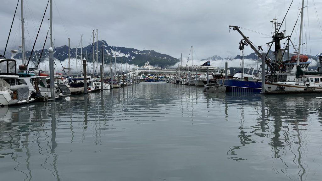 Zurück zu Seward: Es ist im Wesentlichen ein Fischerdorf und der zentrale Zugang zum Kenai Fjords Nationalpark. Das ist wohl auch der Grund, warum hier Kreuzfahrtschiffe anlegen. Die Fjorde erreicht man nur per (Ausflugs-)Schiff und so machen wir eine sensationelle Tour und sehen zahlreiche Gletscher entlang der Fjorde. Zum Aialik Gletscher fahren wir recht nah an die Abbruchkante und halten dort auch länger, so dass wir das Kalben des Gletschers beobachten können, es ist eindrucksvoll zu sehen wenn Eis abbricht und ins Meer stürzt. Die Gletscherkante ist ungefähr 1,5km breit und 100m hoch!