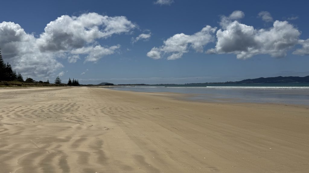 In Anbetracht unseres Zustandes kaufen wir erstmal nur das Wichtigste ein und verziehen uns für 2 Nächte auf einen Campingplatz kurz nördlich von Auckland, mit Blick auf tolle Natur und das Meer. Die Ruhe tut uns gut und es geht uns Tag für Tag besser. Weiter geht es nach Norden, in die Region „Far North“. Wir kommen durch Städtchen wie Ruakaka, Kawakawa, Kerikeri und so weiter. Ihr merkt schon, dass uns diese Namen erstmal fremdartig vorkommen. An der Karikari Halbinsel im Norden gibt es traumhafte Strände und den sogenannten „Coca Cola-See“ (eigentlich Rotopokaka), wir bleiben 2 Nächte und genießen die Sonne und wandern am Strand. Tagsüber fahren wir bis ganz in den Norden zum Cape Reinga, dem nördlichsten Punkt Neuseelands. Auf dem Weg sehen wir noch die 90 Mile-Beach und die großen Dünen. Man kann (theoretisch) mit dem Auto über die 90 Mile-Beach fahren, der nördliche Ausgang ist bei den Dünen, da muss man dann durch einen Fluss fahren, um wieder die geteerte Straße zu erreichen. Das überlassen wir doch eher anderen Abenteurern… Wir bleiben lieber auf der geteerten kurvigen Straße.
