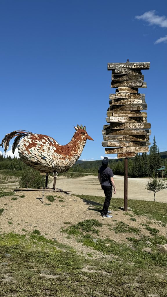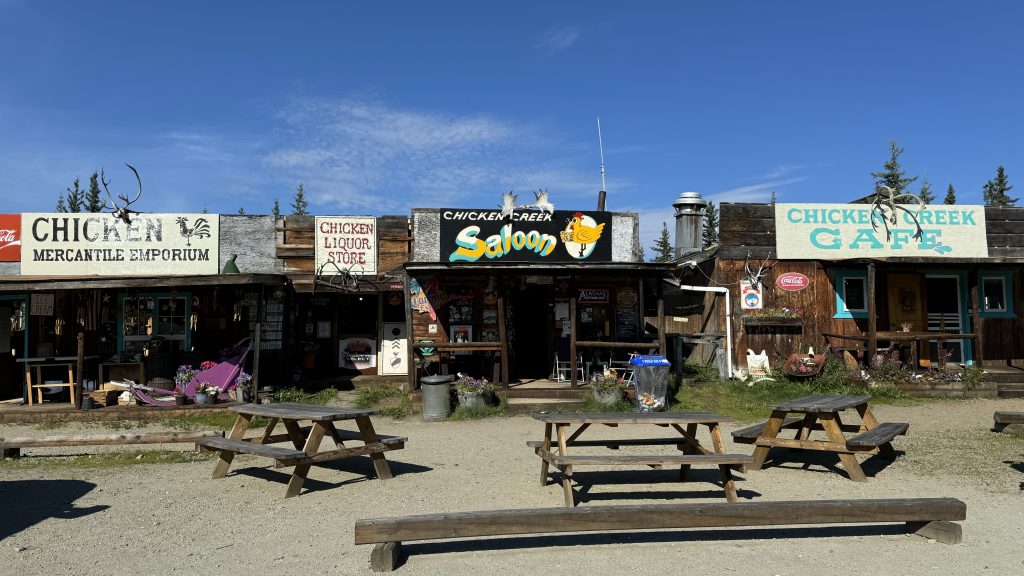 Der Grenzübergang in die USA für uns sehr einfach und entspannt, nur unser Feuerholz mussten wir abladen. Der erste Ort auf der Route war dann Chicken, eine lustige Ansammlung von Hütten, wobei nur 7 Menschen hier ganzjährig wohnen… Übrigens heißt Chicken nur so, weil die Gründer das Wort für Moorschneehuhn (Ptarmigan) nicht richtig schreiben konnten und sie sich dann der Einfachheit halber auf Chicken (Huhn) geeinigt haben. Natürlich war das auch eine Goldgräbersiedlung und es steht hier eine Dredge. Wir bleiben über Nacht in „Downtown Chicken“, das sind 3 Bretterbuden von einem Besitzer mit Café, Saloon und Gift Shop – und einem gratis Campingangebot für nette Gäste. Wir trinken wirklich leckeren Kaffee und essen abends lecker vor dem Saloon. Im (winzigen) Saloon sind Wände und Decken verziert, schaut mal in die Fotos.
