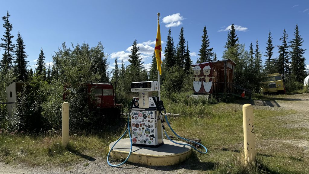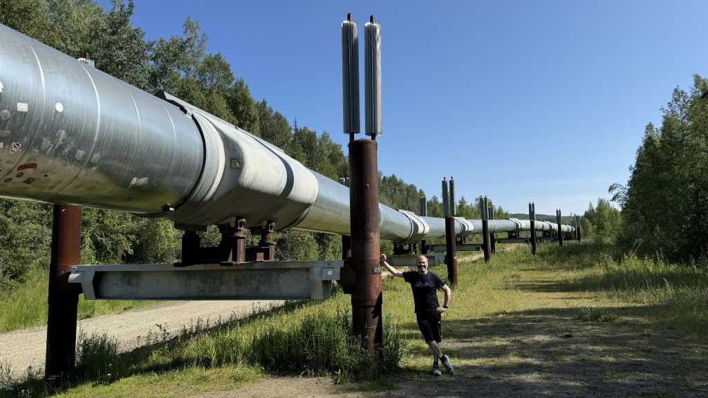 English: We reach Alaska/ USA, where we stayed in the amazing and tiny village of Chicken, and then traveled all the way up to Fairbanks, and just north of it. While Fairbanks itself has little to offer, the Museum of the North is a gem, and surely the huge oil pipeline cutting through Alaska from North to South is a must see. At 65 degrees North, this is probably the northernmost point of our journey, and we face temperatures of 30°C in the shade – what surprise that is!