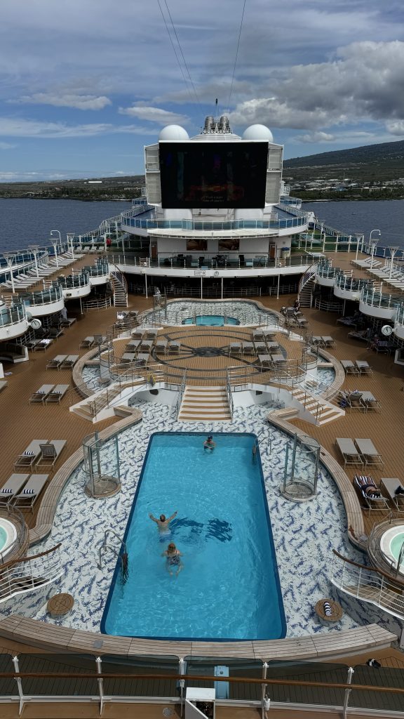 Das Schiff bringt uns auch in den Westen von Big Island und wir bleiben ebenfalls 2 volle Tage in Kailua-Kona. Auch dort mieten wir uns wieder ein Auto und fahren hoch auf einen Vulkan, diesmal den Mauna Kea. Man fährt von Meereshöhe innerhalb von nur einer Stunde bis zum Besucherzentrum auf ca. 2.400m weit über die Wolkengrenze. Da wir beide bereits dort die Höhe deutlich spüren, entscheiden wir nicht noch bis auf den Gipfel zu fahren. Von dort geht es weiter in den Norden der Insel, wo wir große Rinderfarmen sehen. Wer hätte erwartet, dass Hawaii eine nennenswerte Rinderzucht hat? Es passt weniger zu unserem Bild von einem hübschen Südseeidyll, es sieht im Norden der Insel irgendwie eher nach Europa aus. Mehr zum Idyll passt unser Ausflug am nächsten Tag zu einem Schnorchelspot, an dem sich viele Einheimische und auch einige Touristen treffen. Schon wenige Meter vom Strand entfernt schwimmen wir mit bunten Fischen durchs Wasser. Und in der Entfernung sehen wir unser Schiff vor Anker liegen.
